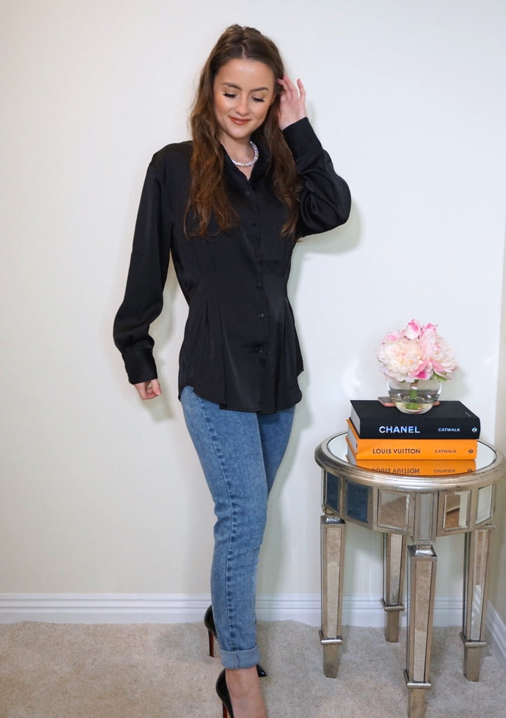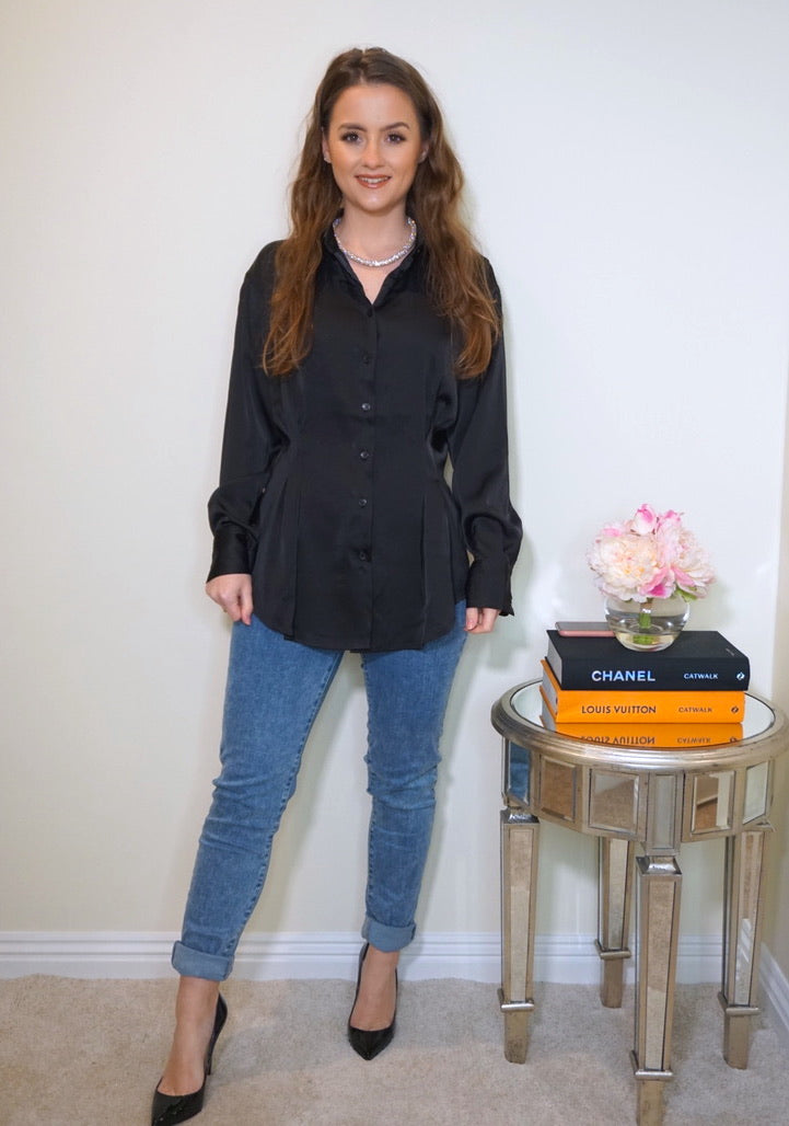 This gorgeous Styled Clothing satin blouse is perfect for an evening out. Pair with leather leggings and heels or chunky boots. Featuring a button up style, pintuck waist and long sleeves. This blouse does have an oversized fit.